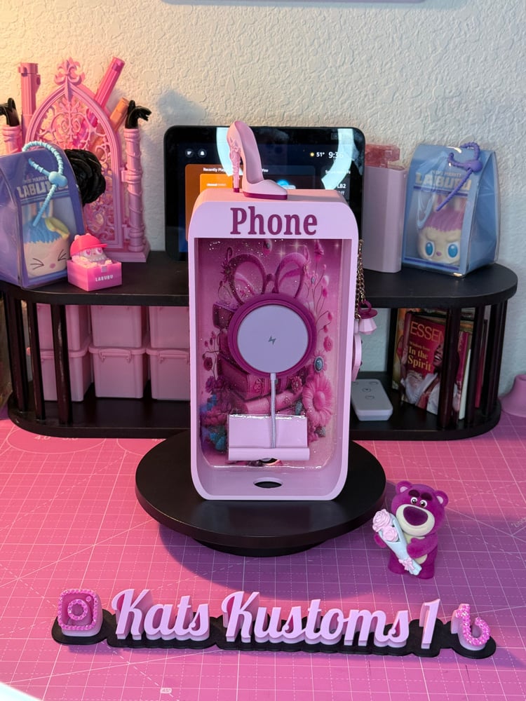 Phone changer station in style of Reto Phone Booth. Can be placed on a counter or can be mounted on the wall. (mounting equipment not included) 3D printed made of hard plastic (PLA). Included Magnetic Wireless charger. Fits most I phone's and Samsung's