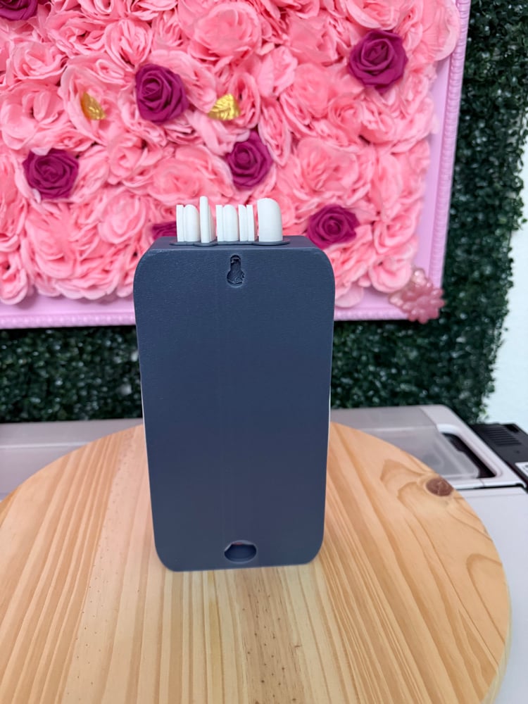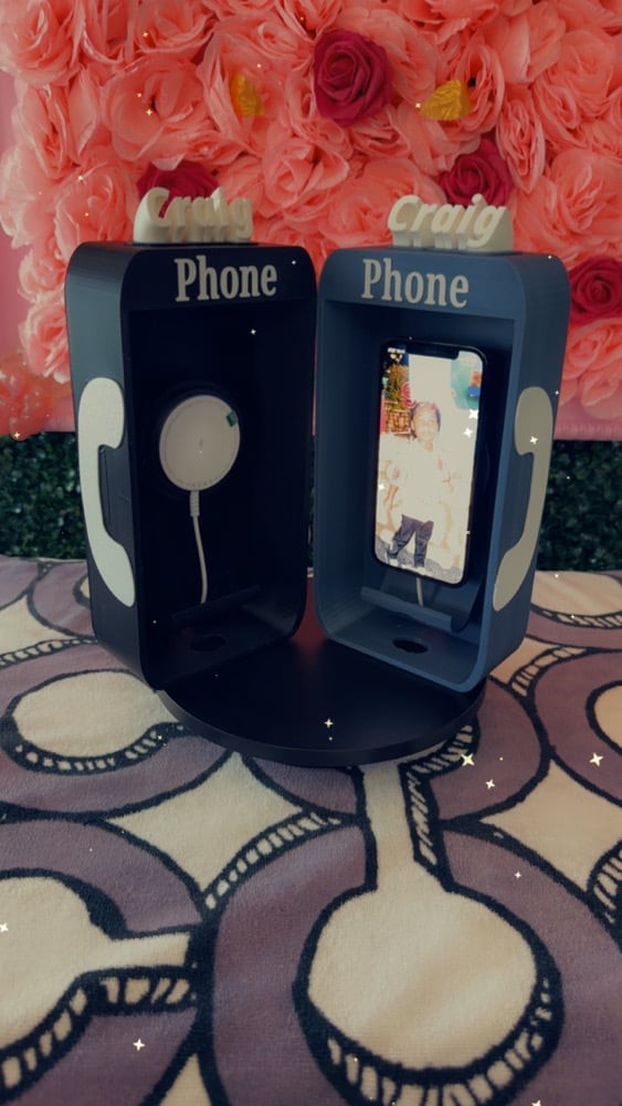 Phone changer station in style of Reto Phone Booth. 3D printed made of hard plastic. Included Magnetic Wireless charger. Size 9.92 inches by 2.29 inches.