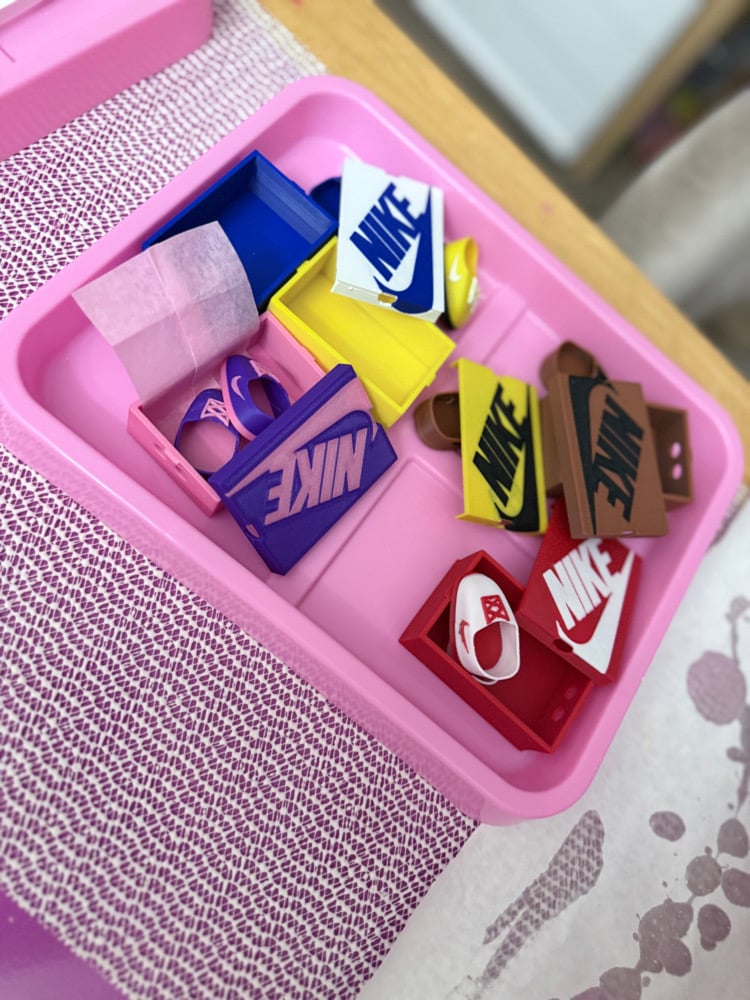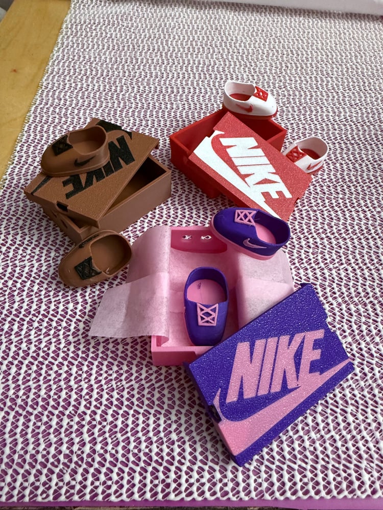 Nike inspired Tennis Shoes with shoe box coordinating colors Made of harden PLA plastic. Fitted for Labubu Dolls. Set includes 1 pair of shoes & shoes box